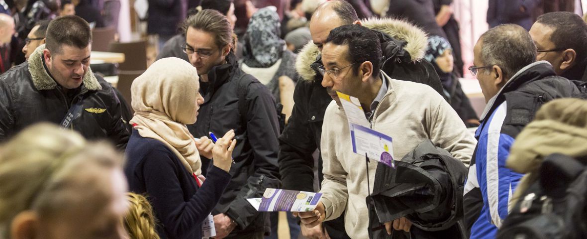In Neukölln wurde ein Kongress-Saal des Hotels zu einer Jobmesse für Geflüchtete umgebaut: 211 Aussteller konnten hier um neue Mitarbeiter werben. Mit großem Erfolg: Über 5.000 Flüchtlinge kamen zur ersten  Jobmesse, um sich bei den Unternehmen und Bildungsträgern über Arbeitsplatz- und Ausbildungsangebote zu informieren. Ziel war es, 1.000 Stellen und Praktikumsplätze an dem Tag zu vergeben.Bilder von Estrel Berlin.